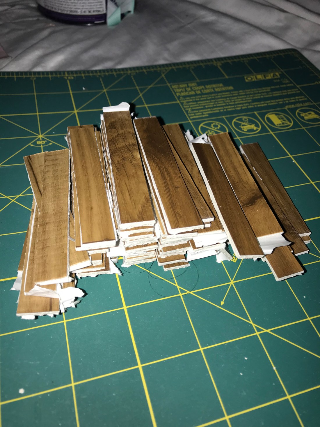 This time instead of measuring on each side of the tile I utilized the cutting mat I purchased from Michael’s. This mat has a ruler at the top and bottom. So I would line the larger planks up with the lines on the board and use the metal ruler to guide the box cutter into straight lines, then break the tile to create the smaller planks. That sounds confusing I think but in the picture you can see the yellow lines on the mat, those are the ones I’m talking about. They’re inch lines but I cut the boards to be a 1/2 inch wide which meant lining the ruler I was using, to keep the cuts straight, with the ruler inch lines at the top and bottom of the cutting mat.