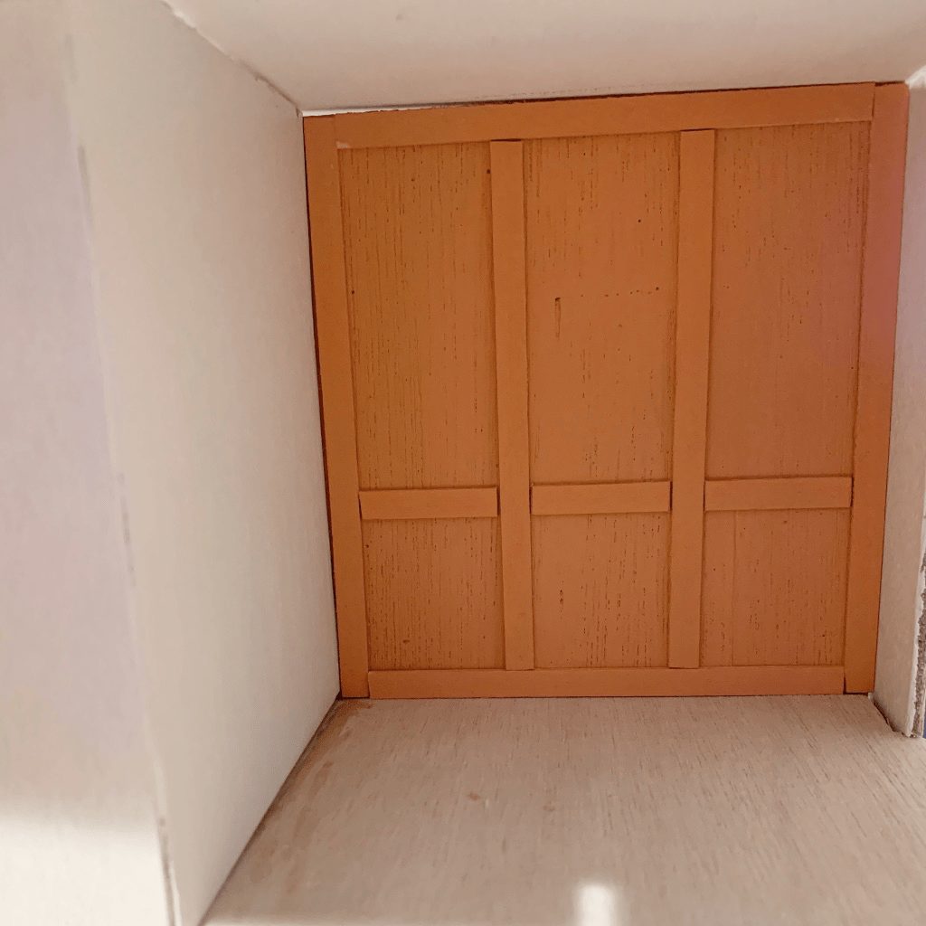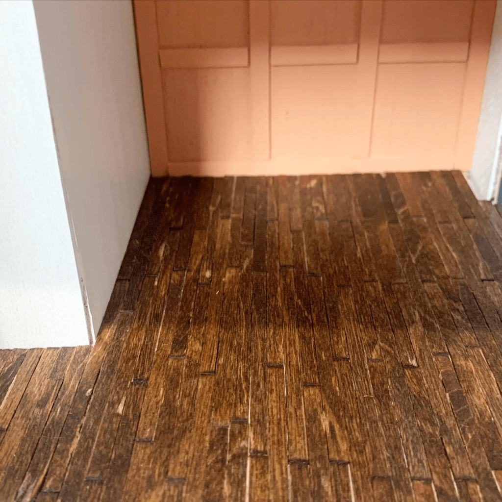 Since this house is 1:24 scale I didn’t think that the flooring I did in the past two houses with vinyl tiles would look the best because of the sizing. They would have also been more difficult to cut in the correct sizes. So for the wood flooring in the dining room (and other rooms that have wood flooring), I decided to go with coffee stirrers.