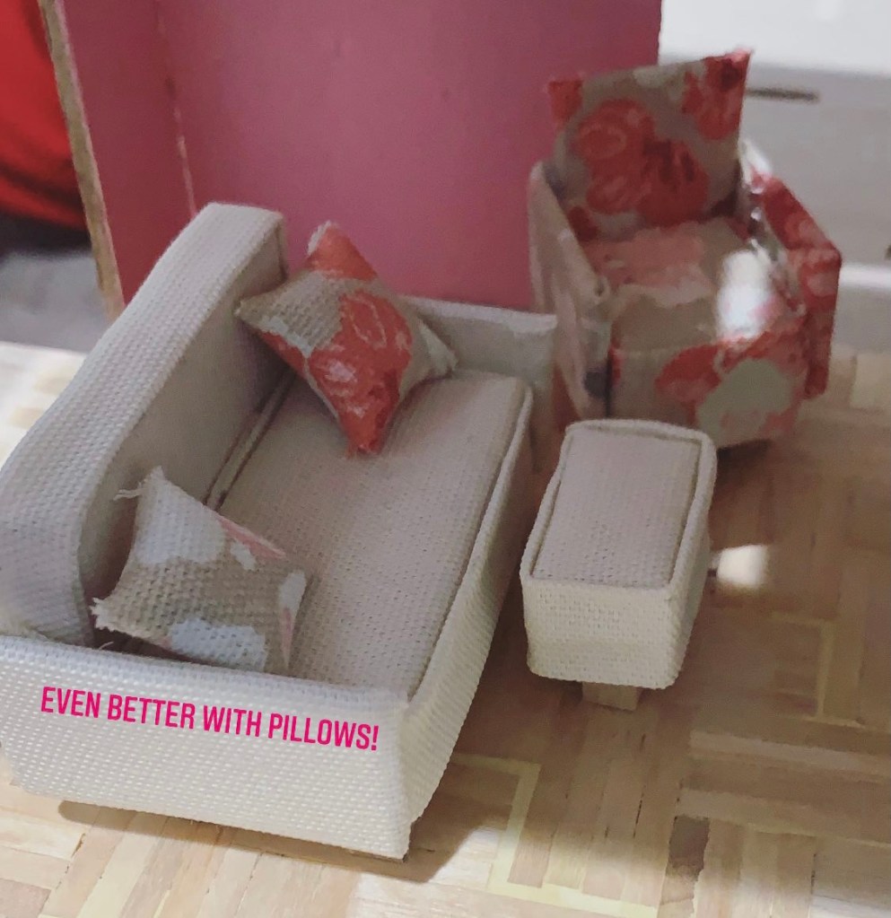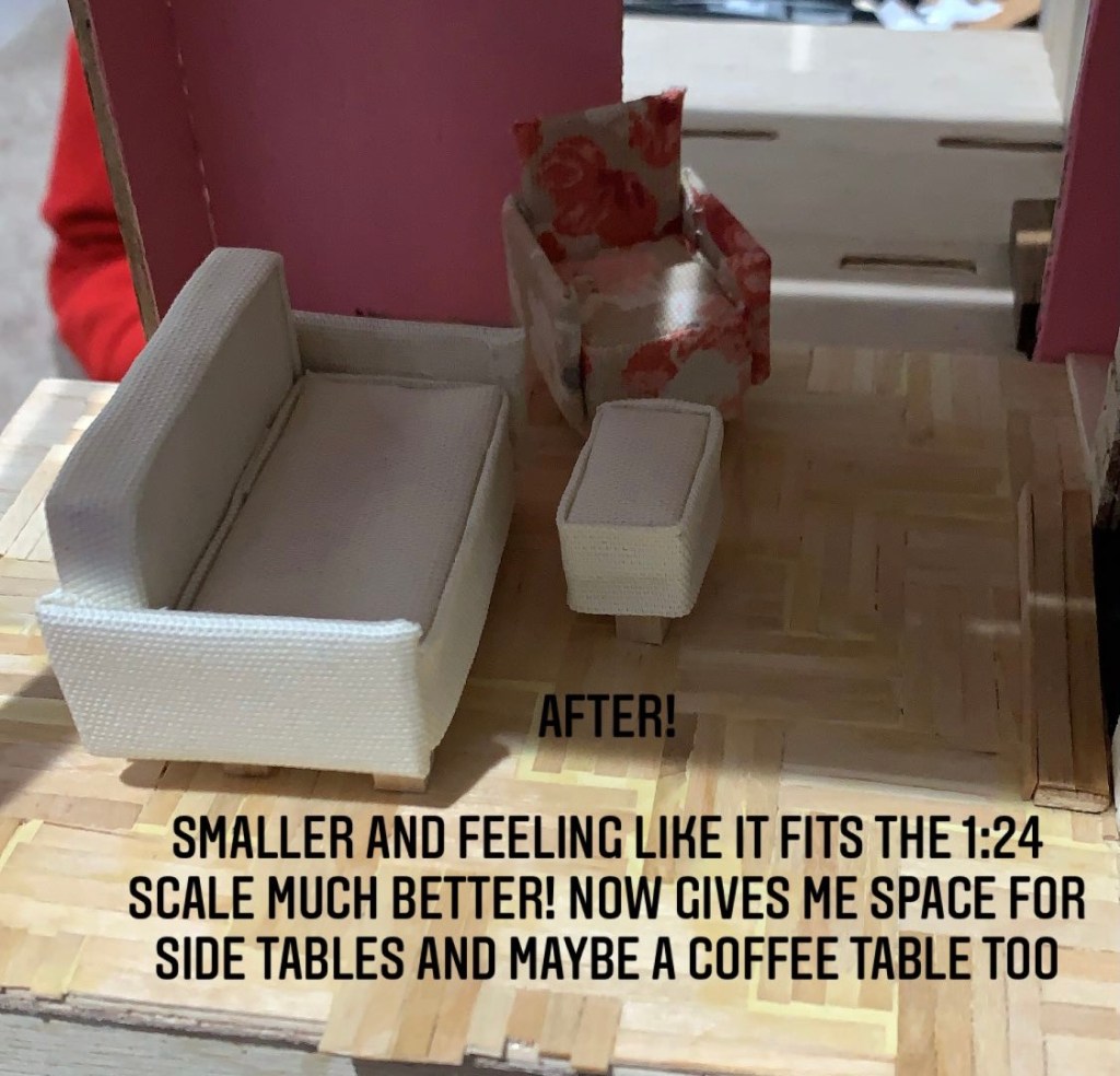 Last night as I was making a bed for the bedroom I realized how off the scale of the couch and chair were in the living room. 1/24 scale is harder than it looks. It’s a lot of calculations. So I remade the couch set smaller. Still the same way as I did in the DIY directions though. Just smaller. Instead of 10 cubes for the couch, I used 8. For the accent chair I used my saw to cut down the 4 cubes that were glued together to make it a 1”x1” cube. 1”x1” in a half scale house would equate to 2’x2’ in real world measurements.