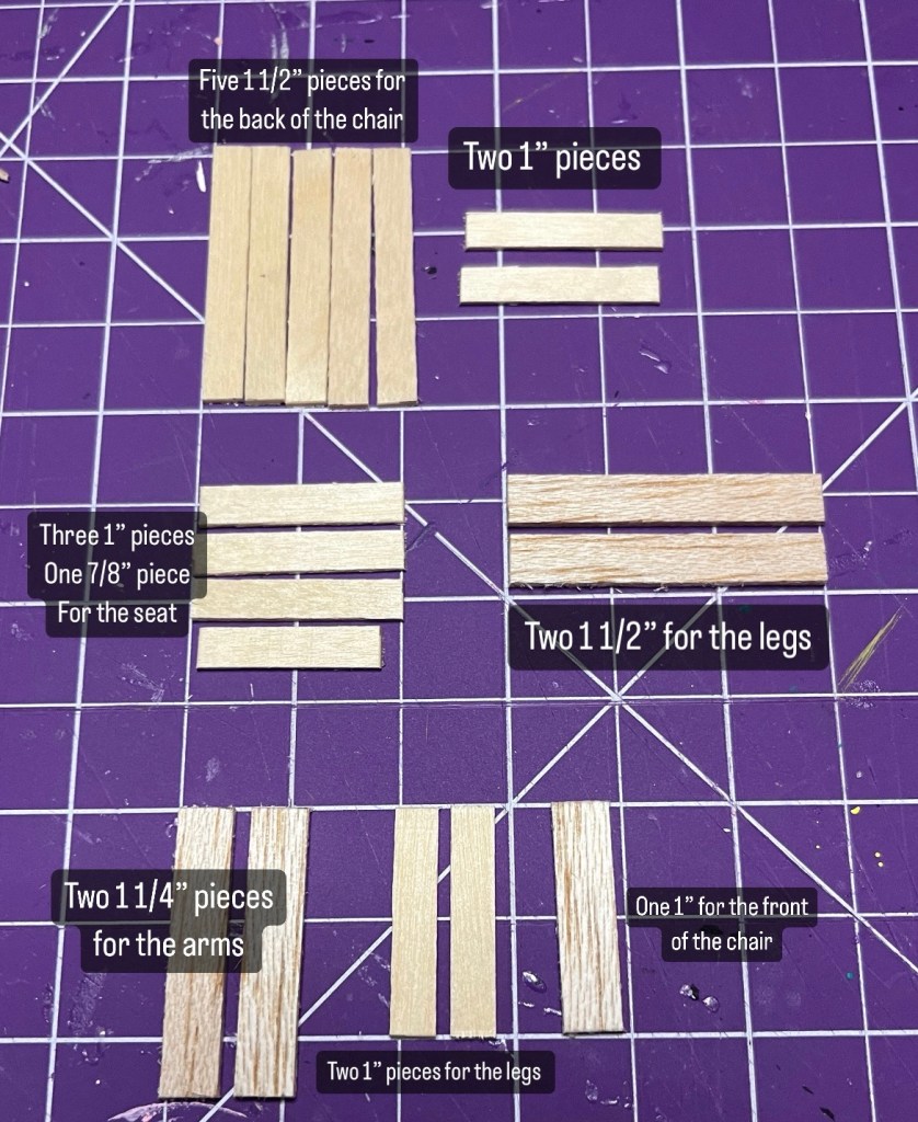 To make this chair I used coffee stir sticks, 1/4” wooden dowel and glue. I used a mitre cutter to cut each piece of wood as well as all of the angles. Picture below shows the lengths for each piece of wood to complete the project.