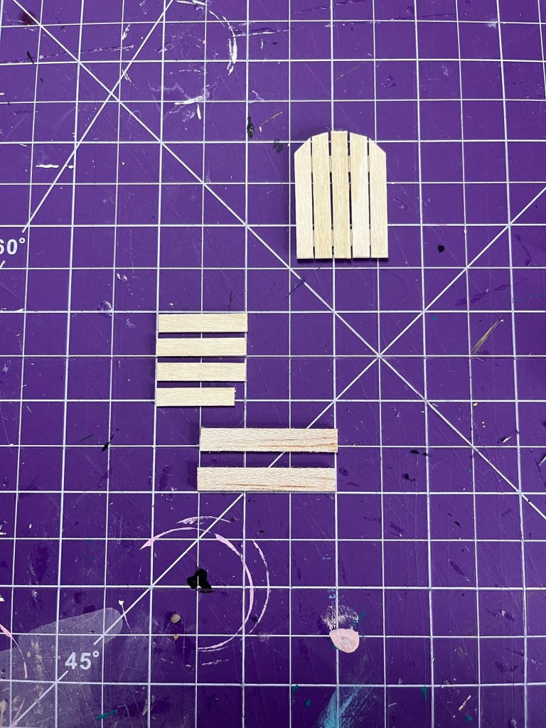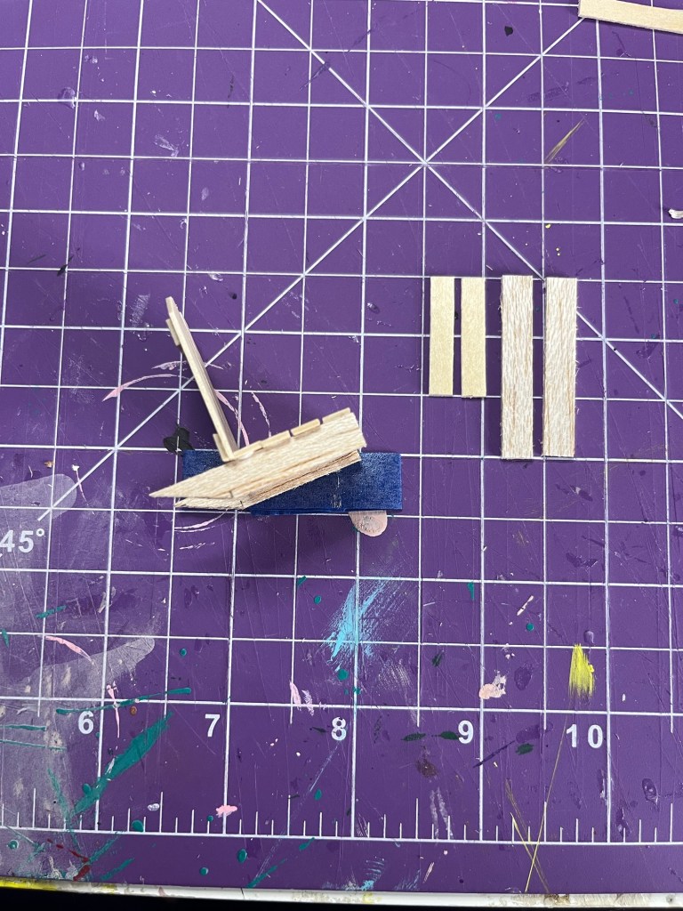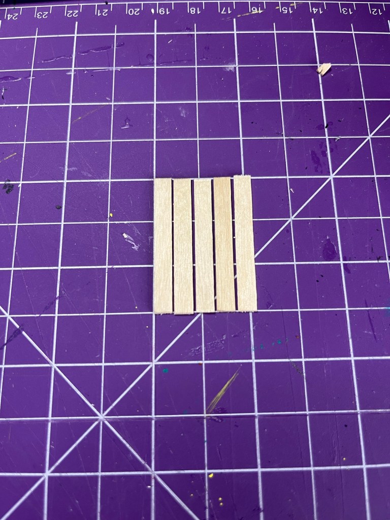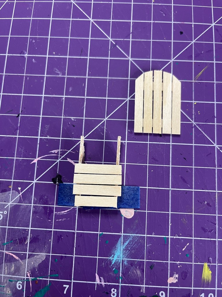 Use the 7/8” piece first and glue it to the end of two leg pieces . I used tape again so that the legs wouldn’t move during this part. After the glue has dried add the three 1” pieces behind, adding in small spaces between the wood